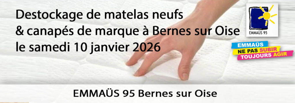 Samedi 10 janvier 2026 Destockage matelas neufs et canapé de marque Samedi 14 février 2026 Bricolage et outillage Samedi 14 mars En attente Samedi 11 avril Jardinage et mobilier de jardin 2024, 2025, anciens, beaux livres, beaux objets, bibelots, bijoux, boutique, braderie, bricolage, cadres, chantier, cinéma, cuir, cuirs, décoration, décorations, électro, emmaüs 95, emmaus Bernes sur oise, emmaus cergy, fournitures, fourrures, grande vente, hifi, jouets, laine, laines, livres, matelas, matériel, mercerie, musique, neuf, neufs, noël, occasion, outillages, outils, pas cher, petits meubles, photo, photographie, sacs, scolaires, tableaux, travaux, upcycling, vaisselle, vaisselles, vente à thèmes, vinyles